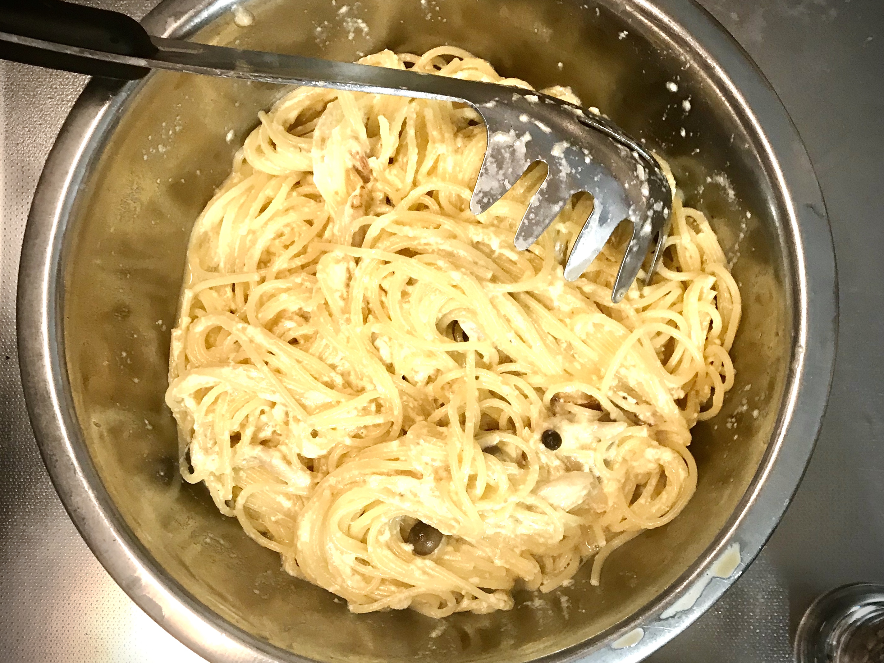 ソースとといた卵、パスタをボールで混ぜます